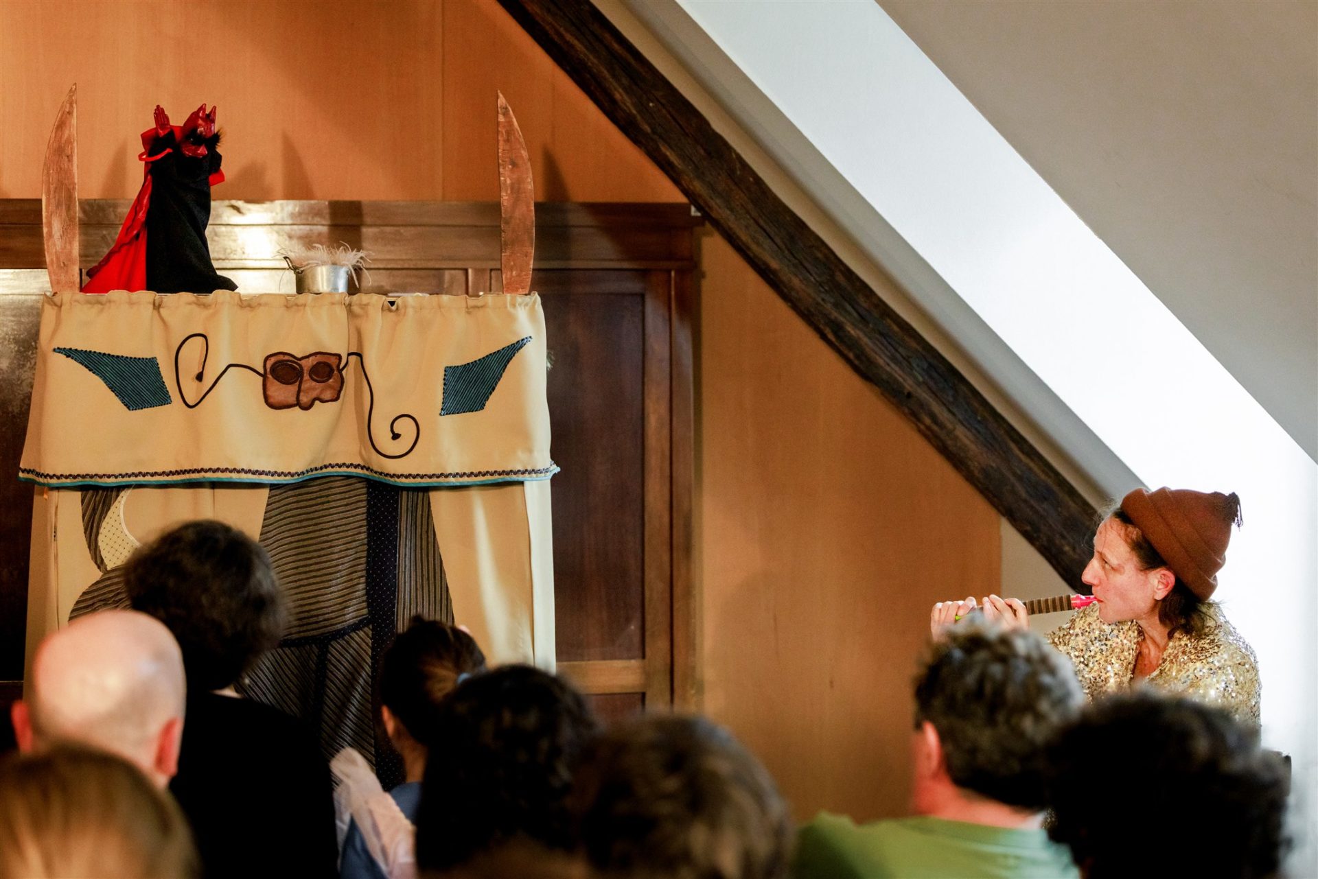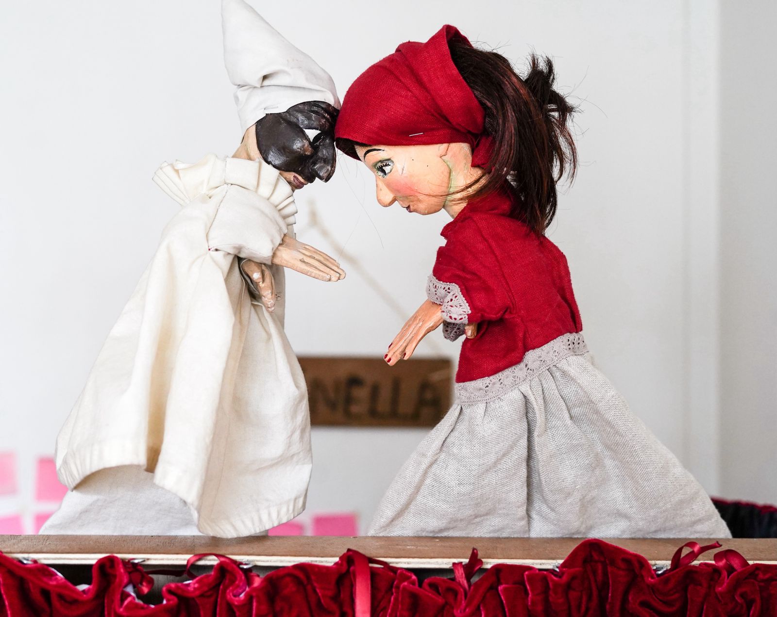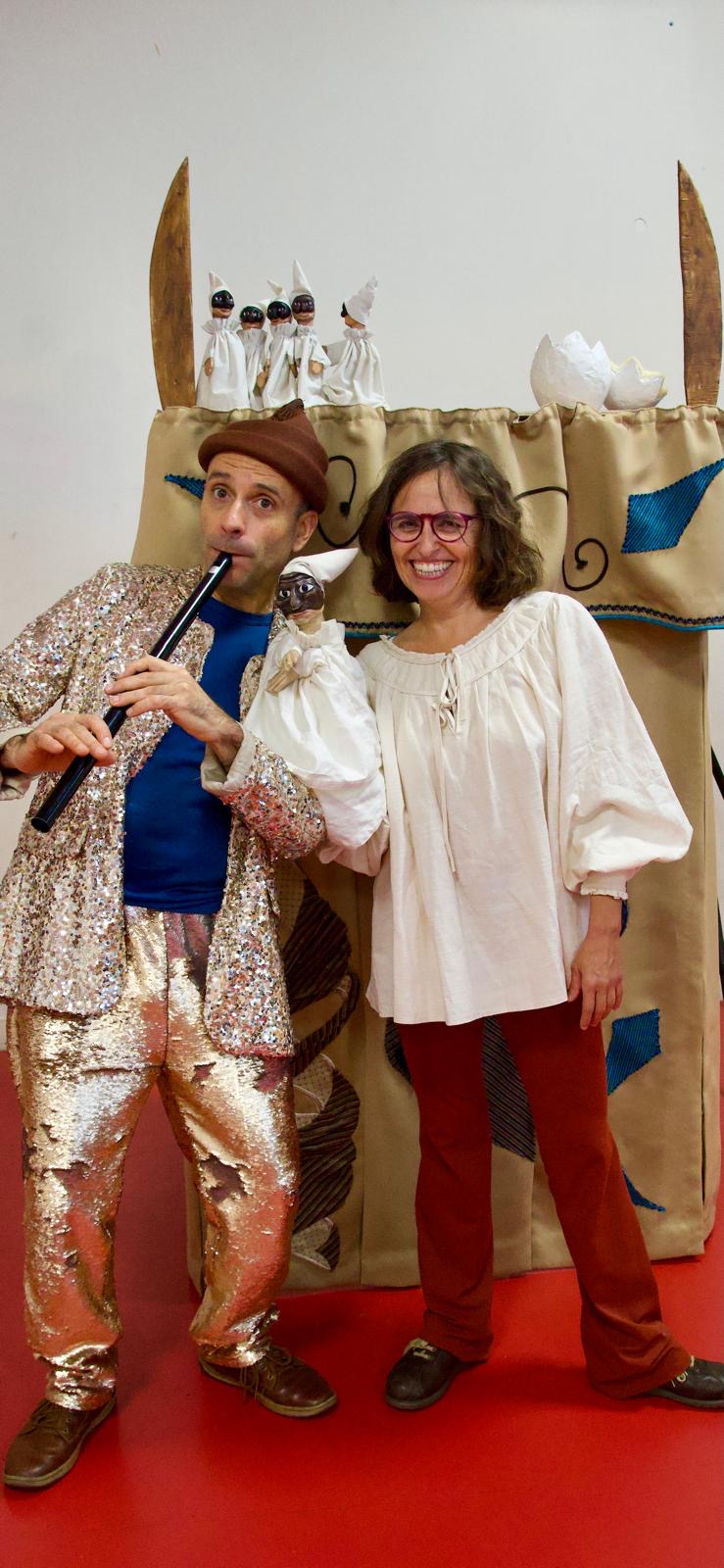 Ce spectacle de marionnettes est joué dans un castelet napolitain, ce petit théâtre traditionnel où prennent vie les figures hautes en couleur de la gaine italienne. Sur scène, un duo complice : la marionnettiste et un musicien qui accompagne le récit, dialogue avec les personnages et entraîne le public dans l’action. Leur interaction vivante crée une atmosphère à la fois joyeuse et rythmée, pleine d’énergie communicative !